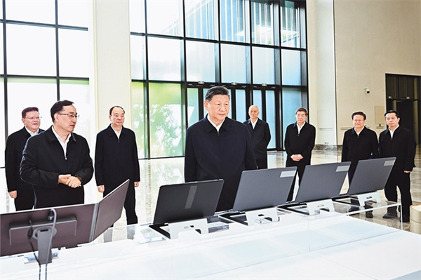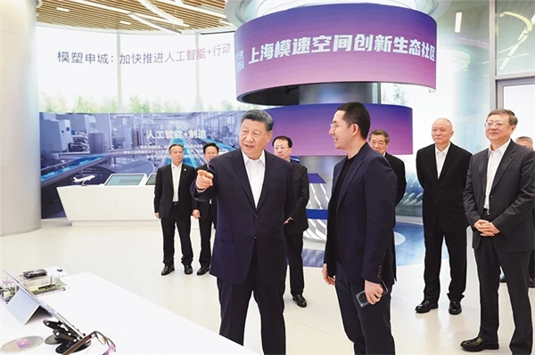 2025年4月29日,中共中央总书记、国家主席、中央军委主席习近平在上海考察。这是习近平在位于徐汇区的上海“模速空间”大模型创新生态社区,察看大模型产品展示。新华社记者 王晔/摄
