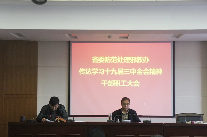 2月26日至28日,中国共产党第十九届中央委员会第三次全体会议召开以来,省委防范处理邪教办高度重视,采取党组学、党组理论学习中心组学、支部党员学等形式,迅速组织党员干部职工学习党的十九届三中全会精神。3月12日,按照办党组安排,召开党员干部职工大会,办党组成员、副主任郭志德同志主持会议,原文传达学习了《中共中央关于深化党和国家机构改革的决定》、习近平总书记在党的十九届三中全会上的报告和讲话精神、《中共中央办公厅关于严明纪律切实保证党和国家机构改革顺利进行的通知》等,切实掀起了学习宣传贯彻热潮。