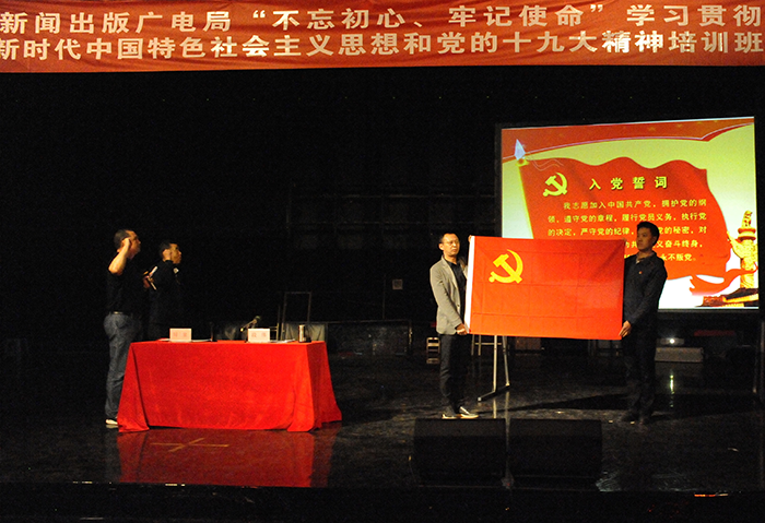 培训班开班式上,组织了发党章、戴党员徽章、唱国歌,重温入党誓词等活动。