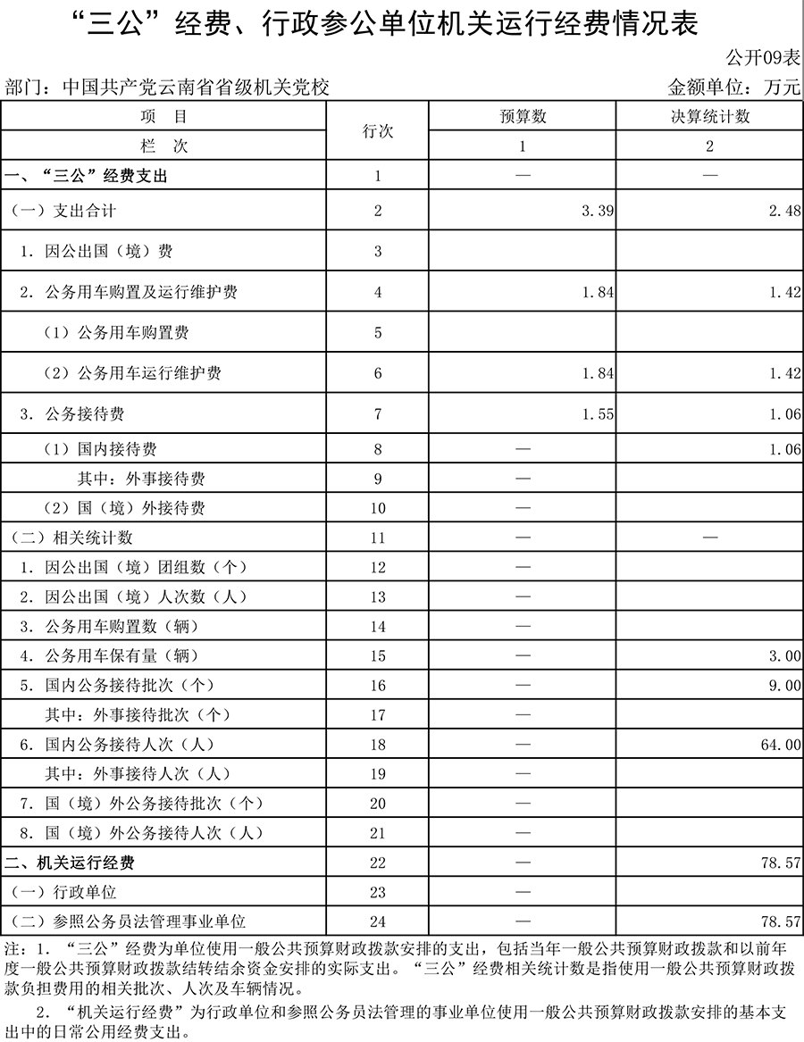 (三)按照党中央、国务院有关文件及部门预算管理有关规定,“三公”经费包括因公出国(境)费、公务用车购置及运行维护费、公务接待费。其中:因公出国(境)费,指单位工作人员公务出国(境)的国际旅费、国外城市间交通费、住宿费、伙食费、培训费、公杂费等支出;公务用车购置费,指单位公务用车车辆购置支出(含车辆购置税、牌照费等);公务用车运行维护费,指单位按规定保留的公务用车燃料费、维修费、过桥过路费、保险费、安全奖励费用等支出;公务用车指用于履行公务的机动车辆,包括省部级干部专车、一般公务用车和执法执勤用车;公务接待费,指单位按规定开支的各类公务接待(含外宾接待)费用。