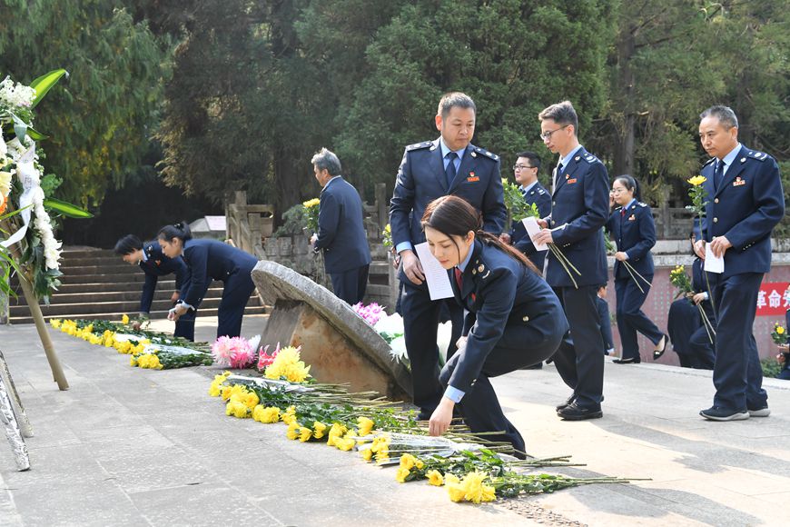 碧波荡漾的黑龙潭,见证了多少感人的英雄事迹,苍松掩映的五老峰,记载了革命烈士的英勇不屈。昆明黑龙潭革命烈士陵园安葬着云南籍优秀共产党员、革命烈士王德三、吴澄、马登云、王复生、张舫、刘平楷的忠骨。五十名税务干部身着蔚蓝的税务制服,于4月1日清晨,手捧黄菊,来到这个云南省重点文物保护单位和云南省爱国主义教育基地,开展学习党史清明祭扫活动。全体税务干部为烈士墓碑献上一束黄菊,在烈士墓前默哀、鞠躬,缅怀先烈,寄托哀思。