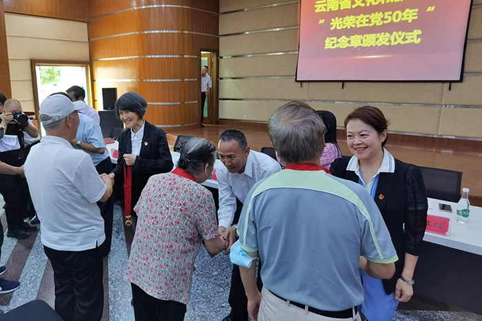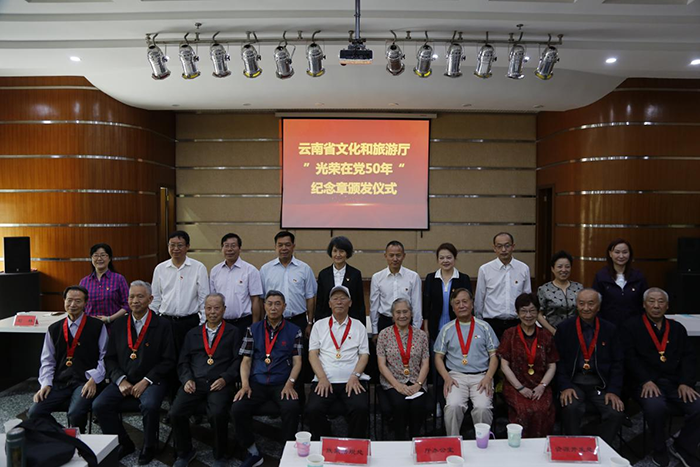 6月27日上午,云南省文化和旅游厅在省图书馆举行“光荣在党50年”纪念章颁发仪式。省文化和旅游厅党组书记、厅长曾艳出席,向获得纪念章的老党员表示衷心祝贺,对老党员们为党的各项事业发展作出的贡献致以崇高的敬意。厅领导班子成员向“光荣在党50年”老党员代表颁发纪念章。