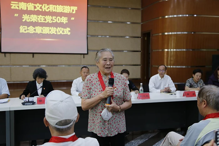 老党员、原省文化厅副厅长孙渭同志代表纪念章获得者发言。她说,感谢党中央对老党员、老干部的关怀,感谢厅党组对老干部的关心。大家虽然退休,但“退休不能褪色”。要坚守党的理想信念,牢记初心和使命,永葆共产党员本色,严守党的纪律,继续发挥先锋模范作用,为党和人民的事业、为云南文旅事业发光发热。
