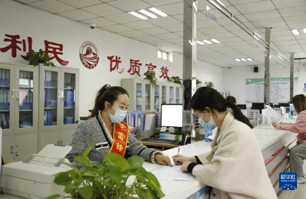 河北省邢台市襄都区宴家屯镇综合服务中心工作人员协助办事群众填写相关表格(2022年3月30日摄)。新华社发(张驰 摄)