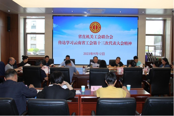 为深入贯彻落实云南省工会第十三次代表大会会议精神,9月12日,云南省直机关工会联合会召开常委扩大会议进行专题传达学习,学习领会省委书记王宁、中华全国总工会党组书记徐留平、省委副书记石玉钢的讲话精神和省总工会主席王树芬所作的工作报告,研究贯彻落实措施。一届联合会主席、副主席和常委,以及经审委委员、女工委委员共30余人参会。省委省直机关工委副书记、省直机关工会联合会主席杨光波作主题传达并提出落实要求。