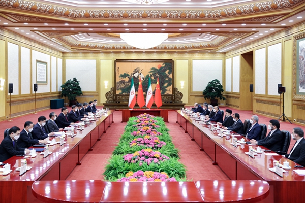 2月14日,国家主席习近平在北京人民大会堂同来华进行国事访问的伊朗总统莱希举行会谈。新华社记者 刘彬 摄