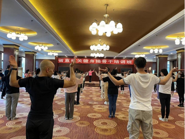“各位同学,注意把胯打开,手臂保持90度……”伴随着动感舞曲《今夜舞起来》,参加省直机关职工健身操骨干培训的学员在教练的带领下整齐划一地律动起来,展示出了他们激情昂扬的精神和铿锵有力的舞步。