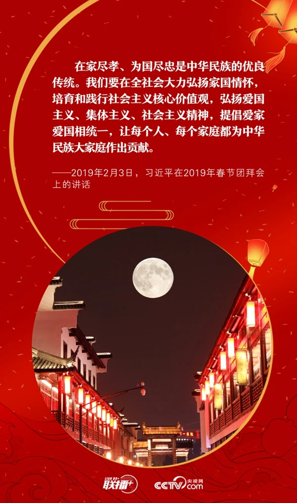 天下之本在国,国之本在家。元宵佳节既是万家团圆、共话美好的日子,也是爱国爱家同频、家国情怀共融的时刻。党的十八大以来,习近平总书记在讲话中多次提到了家庭、家教、家风,深刻阐述了家庭与社会、家庭与国家之间的关系。央视网《联播+》特推出海报,与您一起感悟总书记的家国情怀。