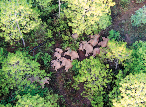2021年4月至8月间,15头亚洲象从云南西双版纳北上,途经玉溪、红河、昆明后安全南返,迁移110多天、行进1300多公里,沿途政府、群众均给予象群精心呵护。这幅人象和谐的美好画卷吸引了全球3000多家媒体关注,报道在190多个国家和地区传播,把温暖传遍了全世界。(云南省委办公厅 供图)