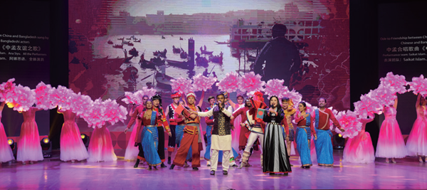 2024年1月,由中国驻孟加拉国使馆、云南省政府新闻办公室和云南省政府外事办公室联合举办的“春之声·金梦想”跨国新春文艺晚会在孟加拉国国家艺术院举行。图为中孟歌手合唱歌曲《中孟友谊之歌》。