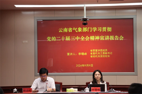 为深入学习宣传贯彻党的二十届三中全会精神,切实引导全省气象部门广大党员干部职工把思想和行动统一到全会精神上来,9月9日下午,云南省气象部门学习贯彻党的二十届三中全会精神宣讲报告会召开,云南省委宣讲团成员、省直机关工委副书记兼省级机关党校校长李曙峰作专题宣讲报告。省局党组书记、局长尹晓毅及在昆局领导出席会议。