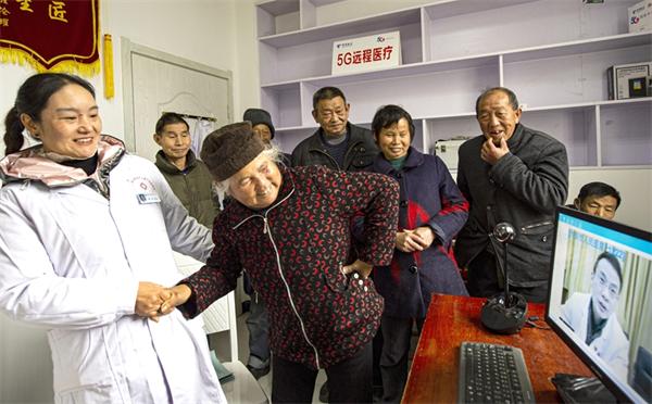 2020年12月3日,安徽省金寨县大湾村的一名村民(前左二)指着自己身体疼痛的部位,在村医(左一)的帮助下向5G远程医疗会诊的专家讲述病情。新华社发(陈力 摄)