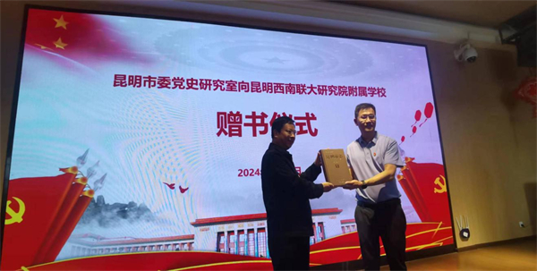 习近平总书记强调:“党的历史是最生动、最有说服力的教科书。”活动第一阶段,昆明市委党史研究室以书籍为载体开展党史学习教育,向昆明西南联大研究院附属学校赠送了《极简云南史》《昆明历史文化读本》、第一轮《昆明市志》、第二轮《昆明市志》等一批党史和地方志书籍,为学生们的健康成长提供精神食粮,用百年党史为青少年的成长培根铸魂,帮助师生们夯实党史和地方志学习基础。