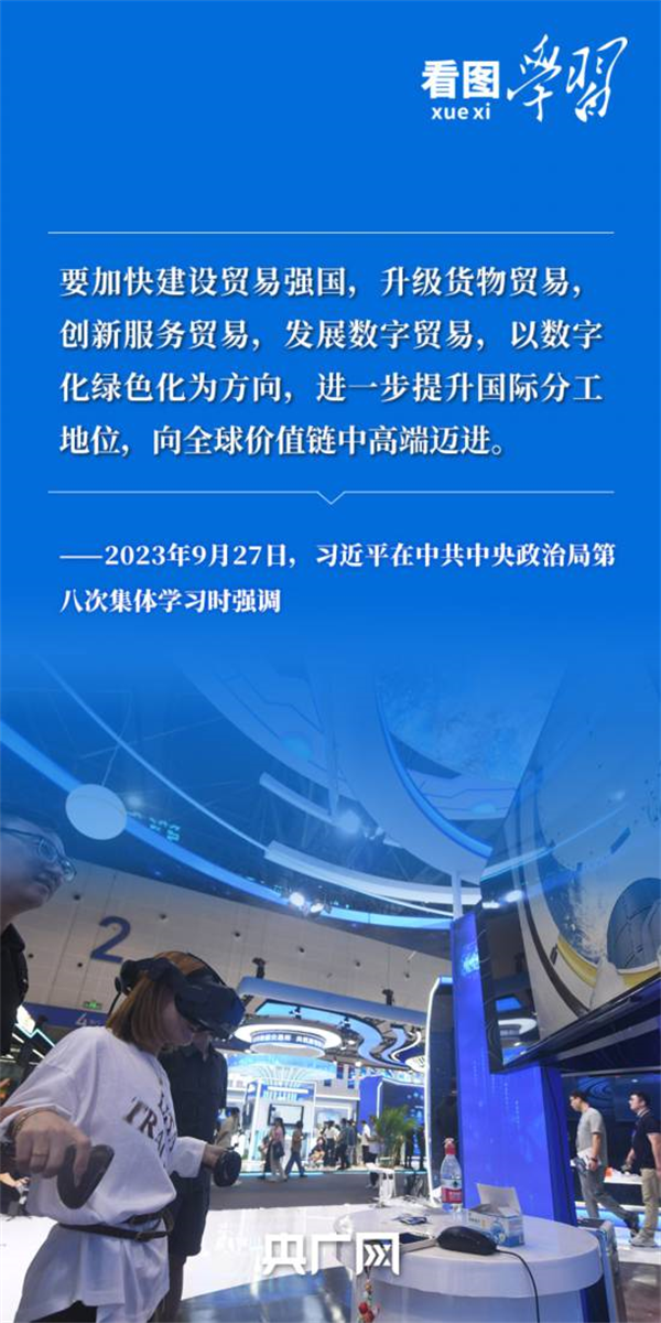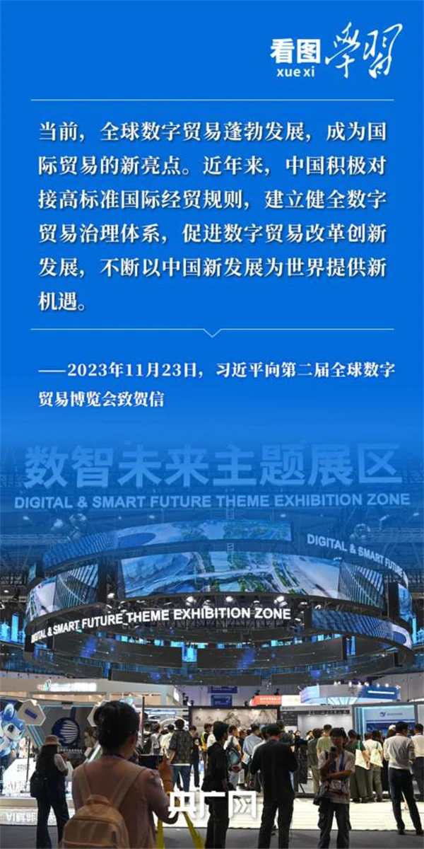 9月25日至29日,第四届全球数字贸易博览会在杭州大会展中心举办,发布百余项中国首发、亚洲首秀、全球首展技术产品,集中呈现生成式AI、多模态感官交互等尖端技术、产品。面向未来,我们要大力推动数字贸易改革创新发展,持续推进数字贸易制度型开放,打造建设贸易强国的“新引擎”。一起来学习!