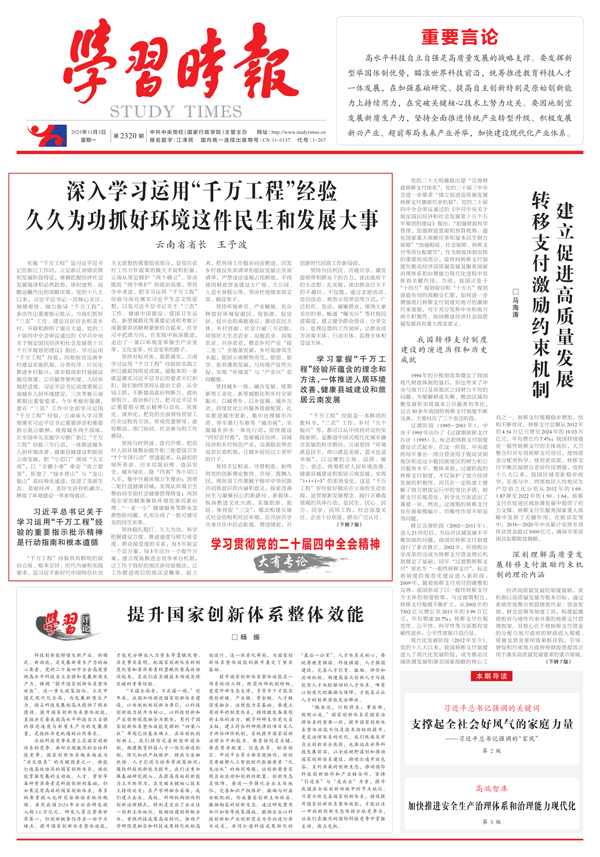 11月3日,《学习时报》头版头条刊发云南省省长王予波署名文章《深入学习运用“千万工程”经验 久久为功抓好环境这件民生和发展大事》