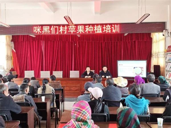 咪黑们村海拔高,降雨少,适合种植耐高寒农作物。经过多年的摸索和发展,已经形成了以萝卜、贡菜、洋芋、大白芸豆、荷兰豆为主的特色种业,但在水果种植上还有空白。驻村工作队在走访中发现不少农户想尝试果树种植,但苦于没有技术指导。在了解到群众的需求之后,驻村工作队第一时间联系到云南农业大学,专门邀请有着多年一线指导经验的敖平星博士进村授课。