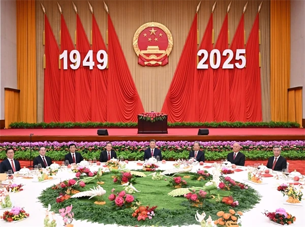 人民大会堂宴会厅华灯璀璨,洋溢着喜庆热烈的节日氛围。主席台上方高悬着庄严的国徽,“1949-2025”大字年号在鲜艳红旗映衬下格外醒目。