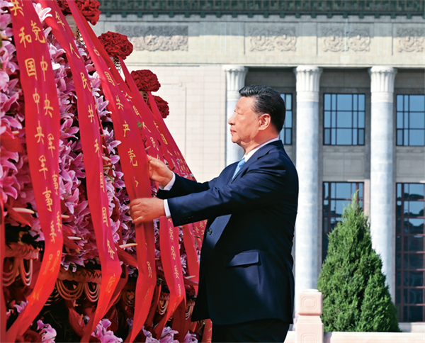 2025年9月30日上午,党和国家领导人习近平、李强、赵乐际、王沪宁、蔡奇、丁薛祥、李希、韩正等来到北京天安门广场,出席烈士纪念日向人民英雄敬献花篮仪式。这是习近平整理花篮上的缎带。新华社记者 李响/摄