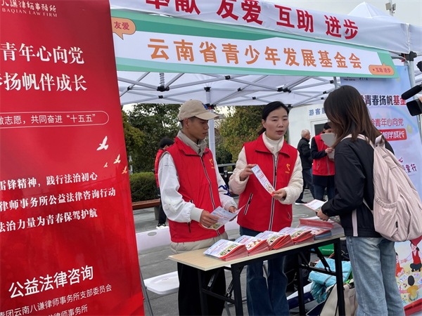 在普法服务区,青基会党支部联合云南八谦律师事务所党支部律师志愿者队伍,聚焦青少年权益保护、旅游维权等群众关心的热点问题,通过发放普法手册、现场专业答疑等形式开展法治宣传教育,把法治服务送到群众身边。此次普法服务也是党支部践行“我为群众办实事”的具体举措,切实将党建工作落到服务青少年、服务群众的实处。