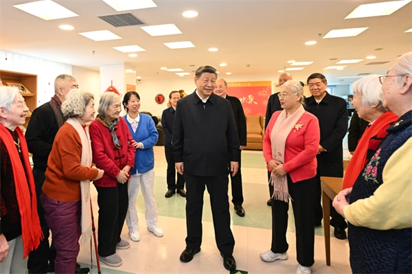 在银龄老年公寓,习近平详细了解老年人健康检查、康复训练、日常起居照料等情况。大厅里,一些老人正在写春联和福字,习近平来到他们中间,欣赏他们的创作,勉励他们老骥伏枥、老有所为,祝他们健康长寿、春节快乐。
