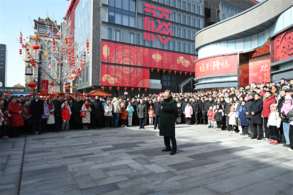 2月9日至10日,中共中央总书记、国家主席、中央军委主席习近平在北京考察并看望慰问基层干部群众。这是10日上午,习近平在东城区隆福寺街区考察时,向全国各族人民和香港同胞、澳门同胞、台湾同胞、海外侨胞致以美好的新春祝福。新华社记者 燕雁 摄