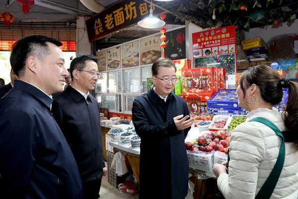 未名城农贸市场年味浓郁、人潮熙攘,鲜肉、蔬菜、水果等应有尽有。王宁、王予波一直牵挂着群众的“菜篮子”,同经营者、顾客交流商品价格、销售等,祝大家马年生意更兴隆、日子更红火;要求管理部门加强商品保供,强化食品安全监管,严格落实消防措施,保障市场繁荣有序。