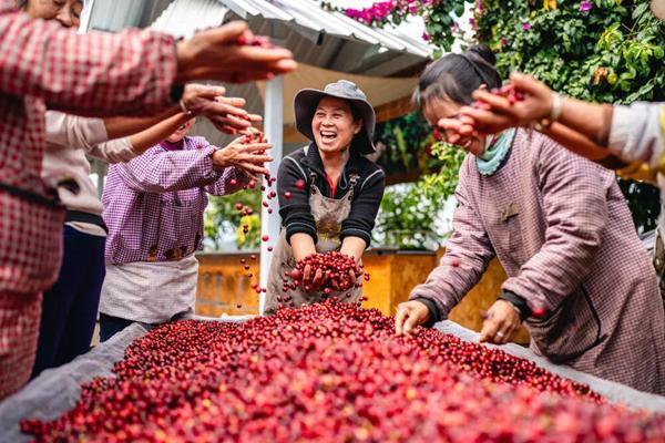 在云南省普洱市思茅区天玉咖啡庄园,庄园经营者和工作人员庆祝咖啡丰收。新华社记者胡超/摄
