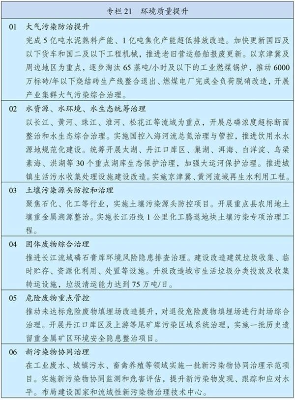 持续深入推进污染防治攻坚,以更高标准改善大气、水、土壤环境质量。以京津冀及周边、长三角、汾渭平原等重点区域为主战场,强化细颗粒物(PM2.5)控制,深入推进重点行业超低排放改造,推动挥发性有机物源头替代和全流程治理,制定下一阶段机动车排放和油品质量标准,深化大气环境绩效分级管理,氮氧化物、挥发性有机物排放量分别下降8%以上,进一步消除重污染天气。加强长江中游、成渝等区域大气污染防治。加强餐饮油烟、恶臭异味和环境噪声污染治理。统筹水资源、水环境、水生态治理,以解决全流域和跨省界突出问题为重点,加强重要江河湖库系统治理和生态保护,基本完成重点流域海域入河入海排污口排查整治,化学需氧量、总磷排放量分别下降6%,巩固城市黑臭水体治理成效、基本消除县乡黑臭水体。加强土壤污染源头防控,推进受污染耕地、建设用地安全利用。