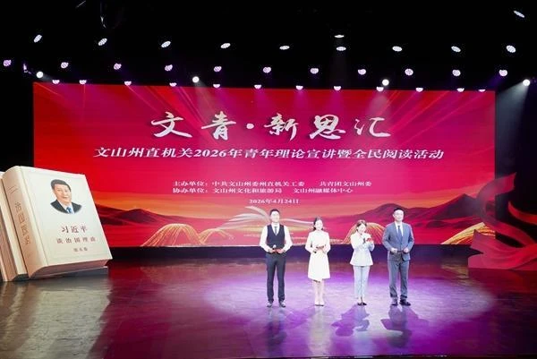 4月24日下午,由中共文山州委州直机关工委、共青团文山州委联合主办的文山州直机关2026年“文青・新思汇”青年理论宣讲暨全民阅读活动在州民族文化工作团艺术客厅成功举办。州直机关党员干部代表、青年干部代表等240余人现场参加活动。